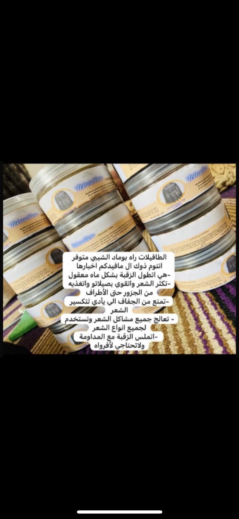 🌿 Pommade Chébé – Soin naturel traditionnel des femmes tchadiennes ✨ Riche en ingrédients naturels comme la poudre de chébé, le beurre de karité et les huiles végétales, cette pommade nourrit intensément les cheveux, les rend plus forts, épais et longs. Elle aide à prévenir la casse, hydrater les pointes sèches et favoriser la croissance des cheveux, surtout pour les cheveux crépus, frisés ou secs. 👉 Idéale pour maintenir l’hydratation et la brillance naturelle de la chevelure. 🌿 مرهم الشَيبِه (Chébé) – علاج طبيعي تقليدي تستخدمه النساء التشاديات للعناية بالشعر ✨ يحتوي على مكونات طبيعية غنية مثل بودرة الشَيبِه وزبدة الشيا والزيوت النباتية، مما يساعد على تغذية الشعر بعمق وجعله أكثر قوة وكثافة وطولًا. يساعد على منع تساقط الشعر وترطيب الأطراف الجافة وتحفيز نمو الشعر، خصوصًا للشعر المجعد والجاف. 👉 مثالي للحفاظ على رطوبة ولمعان الشعر الطبيعي .