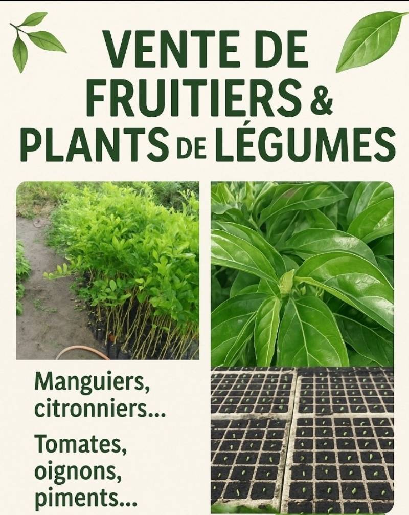 Envie de transformer votre jardin, votre ferme ou même un petit espace en véritable oasis verte ? Nous vous proposons une large gamme de plants fruitiers (manguiers, citronniers, goyaviers, papayers, grenadiers…) et de plants de légumes (tomates, poivrons, choux, laitues, oignons, courgettes, aubergines, etc.), prêts à être mis en terre… et livrés partout en Mauritanie ! Nos plants sont produits avec soin, sélectionnés pour leur robustesse et leur adaptation au climat mauritanien. Que vous soyez agriculteur, particulier, association ou projet de développement, nous vous apportons la qualité à domicile. 🌱 Ce que nous offrons : Plants fruitiers résistants et productifs Pépinières de légumes de haute qualité Conseils sur la plantation et l’entretien Livraison rapide dans toutes les régions de Mauritanie Prix compétitifs et possibilité de commandes en gros .