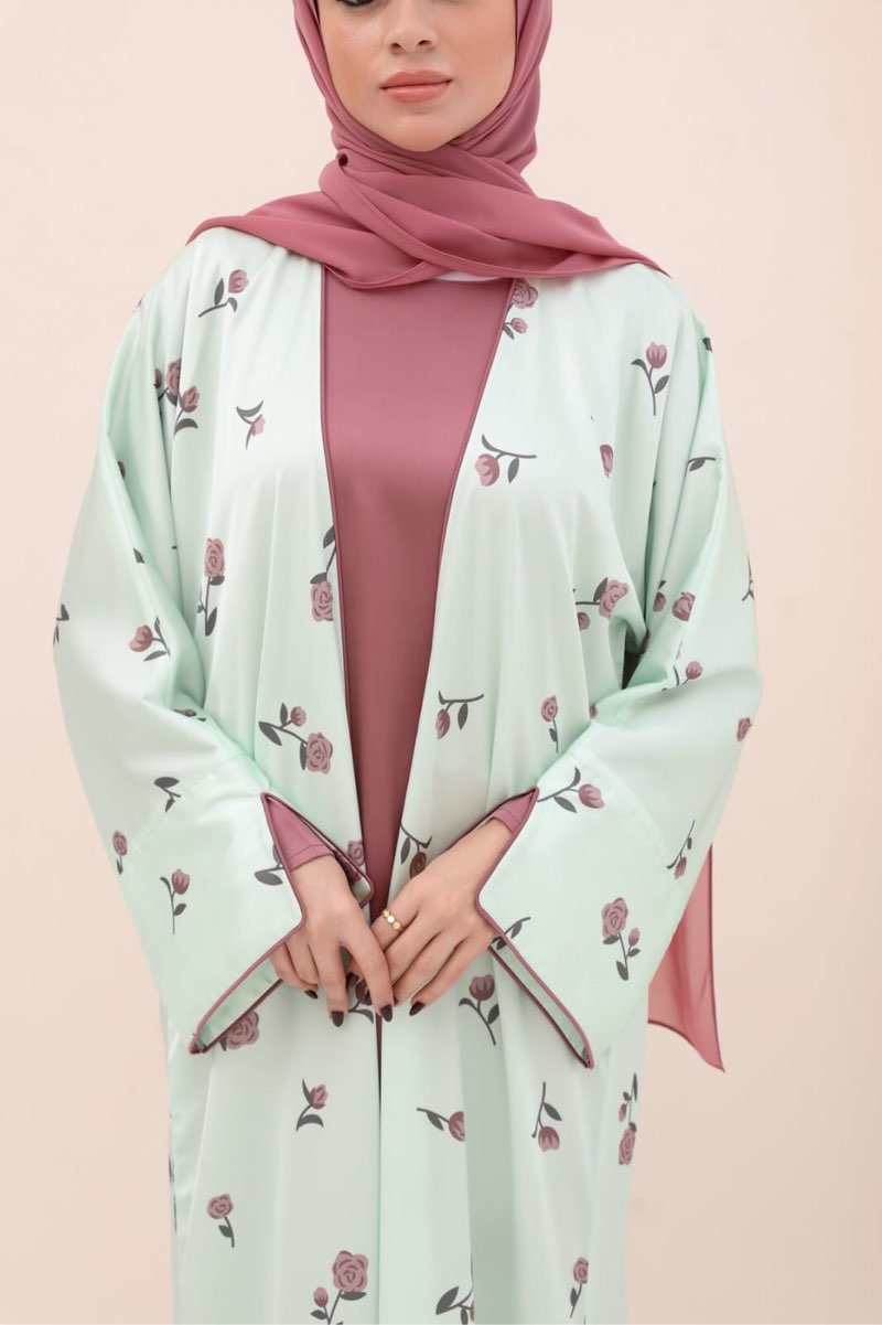 طقم عباية حريرية مطبوعة بنقوش زهرية باللون النعناعي متوفر بالكمية +شحن مجاني .