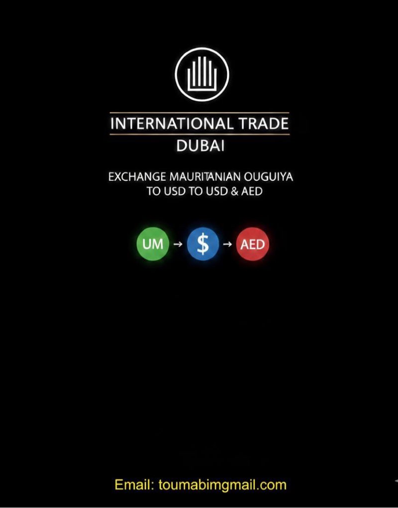 🌍 International Trade Dubai 🌍 هل تبحث عن الطريقة الأسرع والأكثر أماناً لتحويل أموالك؟ نحن نوفر لك خدمة تبادل العملات بكل سهولة وموثوقية، لربط تجارتك وأعمالك بين موريتانيا 🇲🇷 ودبي 🇦🇪. ✨ خدماتنا تشمل: ✅ تحويل الأوقية الموريتانية (UM) إلى دولار أمريكي ($). ✅ تحويل الأوقية الموريتانية (UM) إلى درهم إماراتي (AED). ✅ أسعار تنافسية وسرعة في التنفيذ. 📧 للتواصل والاستفسار: [toumasbim@gmail.com] International Trade Dubai .. جسركم التجاري الموثوق .